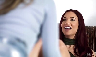 Lesbo Mira having joy while licking Olivia's sensitive clit