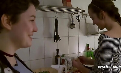 Horny lesbians lick each other's ass and cunt in the kitchen