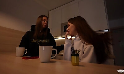 Girlfriend with zucchini fucked busty milf in the kitchen, lesbians Pov.